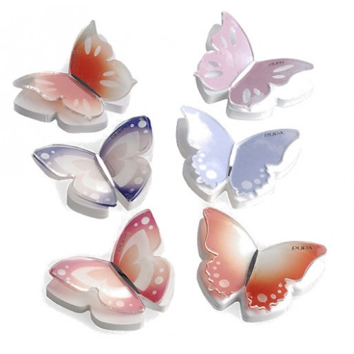 Licht, kleurrijk en elegant. Zes kleine, kleurige vlinders met gespreide vleugels. In de vleugels make-up in delicate kleuren.